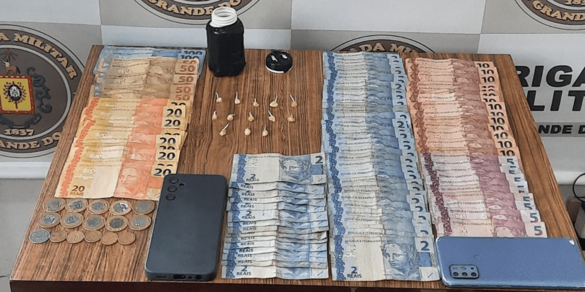 Diante da atitude suspeita, os policiais abordaram o grupo. O homem de 27 anos, identificado como o responsável por descartar o pote, foi revistado, e os agentes encontraram 13 pedras de substância semelhante a crack dentro do recipiente. Além disso, ele possuía R$ 242 em dinheiro trocado e um celular da marca Motorola.