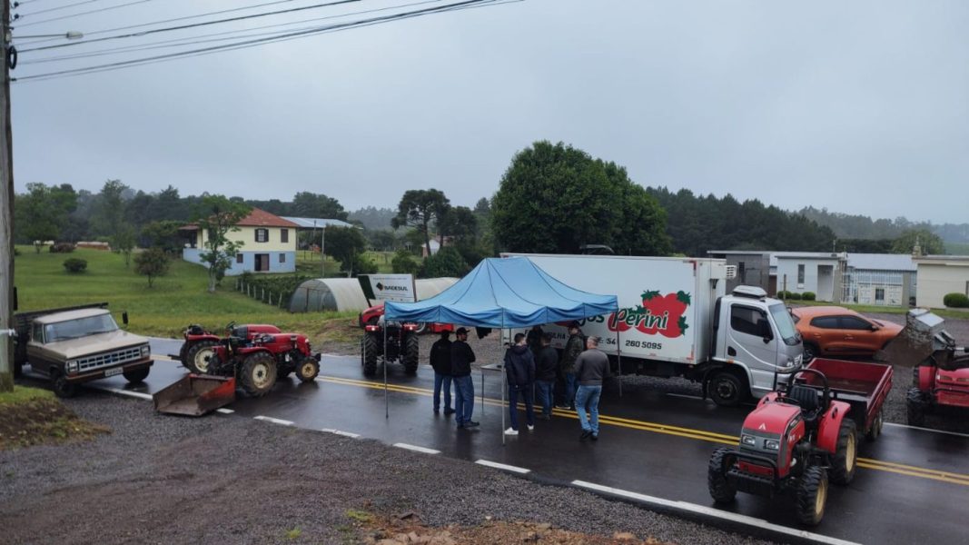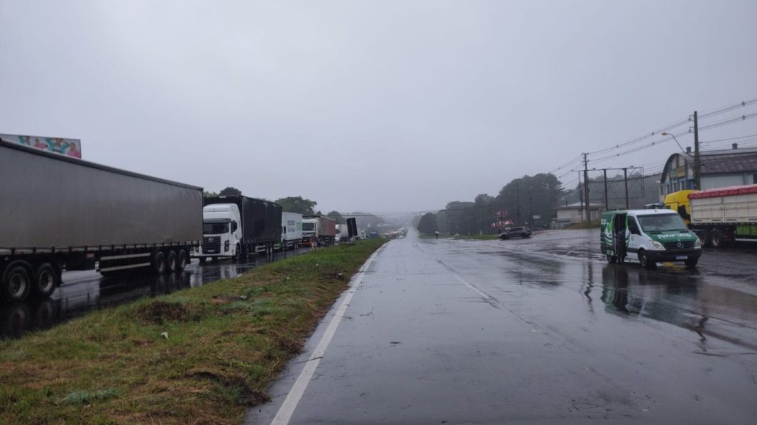 Bloqueios no Km 65, em Forqueta, entre Caxias e Farroupilha, e no Km 96, em Flores da Cunha, com bloqueio total em ambos os sentidos.